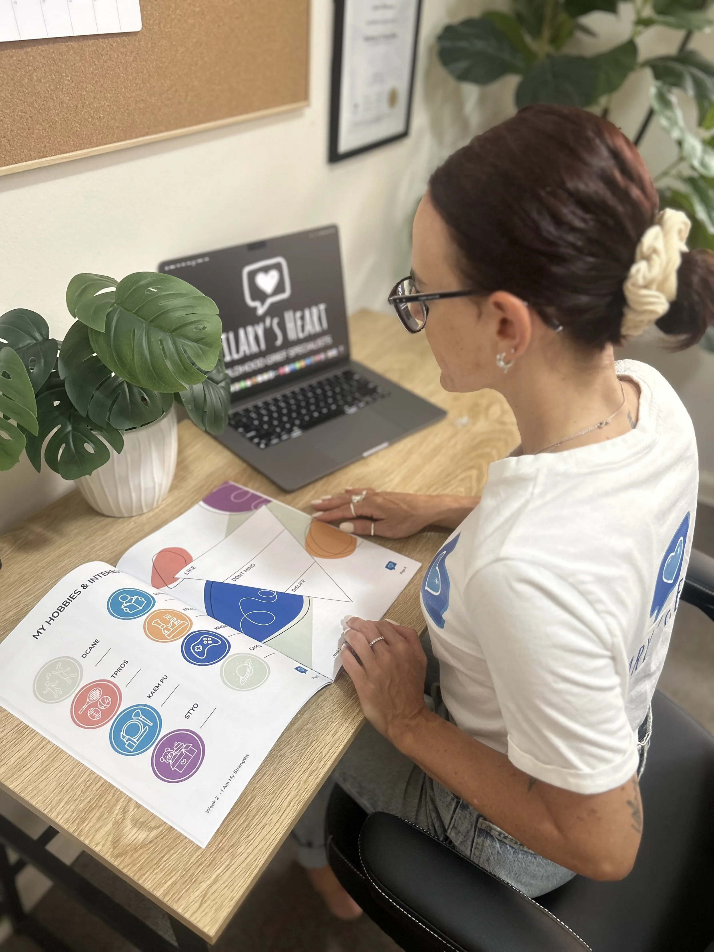 Each participant receives a combined workbook and journal to support their engagement. Individual or sibling sessions are available when siblings fall within the same age group.